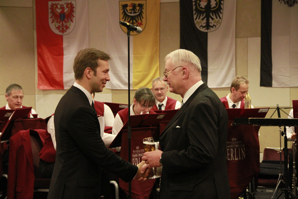 Volker Tschapke, Präsident der Preußischen Gesellschaft bedankt sich bei Herrn Schilling, dem Dirigenten des Spandauer Blasorchester 1960 e.V. | |