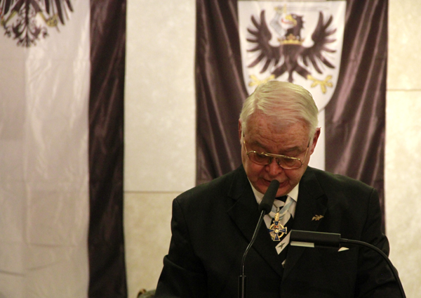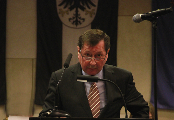 | Volker Tschapke, Präsident der Preußischen Gesellschaft, während seiner Ansprache, in der er die Verbundenheit zur deutsch-russischen Freundschaft ausdrückt. |