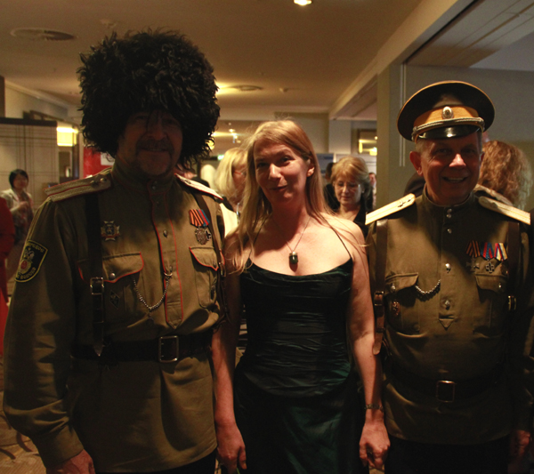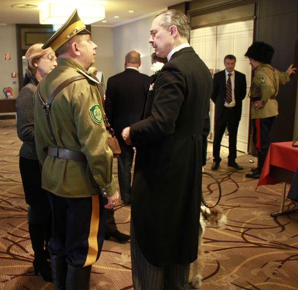 Oleg Graf Siemionow in einer Kosakenuniform im Gespräch mit Henry de Winter. | |
