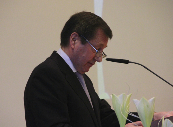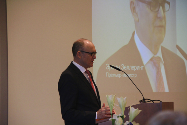 Erwin Sellering, seit 2008 Ministerpräsident von Mecklenburg Vorpommern, begrüßt Teilnehmer des Russlandtages: "Ich freue mich, dass so viele gekommen sind, die miteinander ins Gespräch kommen wollen und denen ein guter Austausch zwischen Mecklenburg-Vorpommern und dem Leningrader Oblast und zwischen Deutschland und Russland insgesamt am Herzen liegt". |