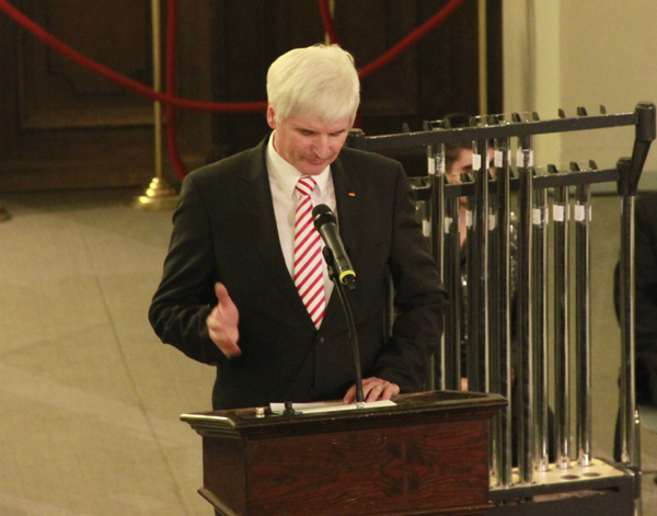 Johannes Selle, MdB, während seiner bewegenden Rede insbesondere über das verbindende Element der Musik und der Sprache. Er dankte in seiner Rede auch Bernhard Kaster, MdB, dem Vorsitzenden der Deutsch-Russischen Parlamentariergruppe für seinen unverbrüchlichen Einsatz für Verständigung zwischen der DUMA und dem Deutschen Bundestag.